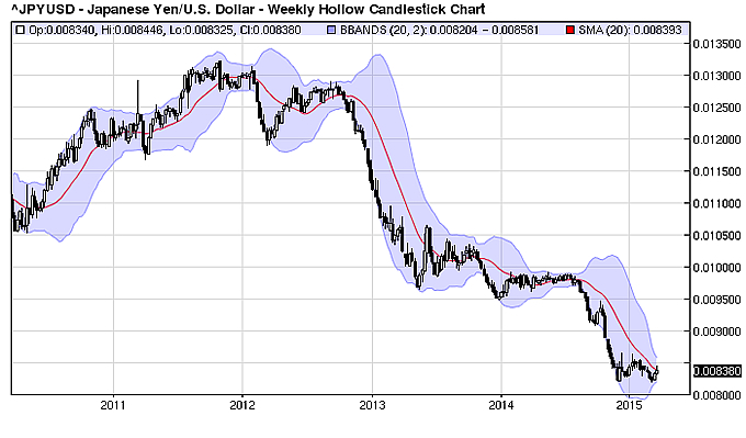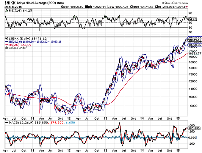 Beleidsmakers zijn echter bang, dat door het wegvallen van inflatie, de consumenten weer de hand op de knip houden in afwachting van betere tijden en dus lagere prijzen. Die houding is een van de voornaamste oorzaken geweest van de lange periode van deflatie, waar het land door is geteisterd. Dat gevaar lijkt reëel, want in april en mei gaan de prijzen voor elektriciteit en gas dalen. Dat zal de deflatoire spiraal alleen nog maar versterken. Voor centrale bankier Haruhiko Kuroda is de huidige trend aanleiding geweest om publiekelijk te verklaren, dat de inflatiedoelstelling voor 2015 niet gehaald zal worden. De markt gaat ervan uit, dat de Bank van Japan op korte termijn zal aankondigen het monetaire stimuleringsbeleid verder te intensiveren. Daarbij zoemt een maandelijks bedrag van $ 100 miljard rond. De aandelenbeurzen nemen hier al een voorschot op. Ze hebben in maart het hoogste niveau in meer dan 15 jaar bereikt!