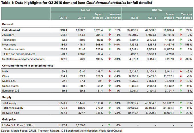 Cijfers goudmarkt over tweede kwartaal van 2016 (Bron: World Gold Council)
