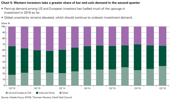 Ook in Europa was het goud niet aan te slepen, want met een totaal volume van 104 ton was dit de grootste afzetmarkt voor fysiek goud. Vooral in april en mei werd er veel goud gekocht door spaarders en beleggers, wat voor een groot deel toegeschreven kan worden aan de Brexit. Na afloop van het referendum schoot de goudprijs met 10% omhoog, met veel winstnemingen tot gevolg. Hoeveel goud er na afloop van de Brexit verkocht is kan de World Gold Council op basis van deze cijfers nog niet zeggen, omdat het referendum pas tegen het einde van juni plaatsvond.