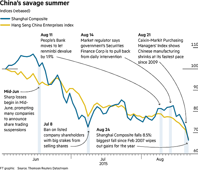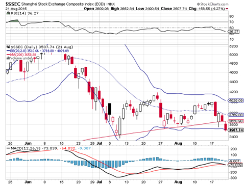 Er was zowel in Europa als in de Verenigde Staten sprake van een opluchtingsrally. De bijna-crash van maandag 24 augustus volgde op een rumoerige voorafgaande week. In die week verloor de Shanghai Composite Index ruim 12% met als hoogtepunt of zo u wilt dieptepunt op vrijdag 21 augustus. Toen werd bekend, dat de zogeheten Caixin-Markit Index van Inkoopmanagers de snelste krimp sinds 2009 had genoteerd en uit was gekomen op 47,1. Het was het laatste slechte nieuws in een lange reeks die ongeveer 2 maanden daarvoor begon. Aan het begin van de maand juli werd bekend, dat de exportprestaties van China op zijn zachtst gezegd zeer te wensen overlieten. Ook toen dreigde de Chinese beurzen in een vrije val terecht te komen. In korte tijd verloor de Shanghai Composite 30% van zijn waarde. Op 8 juli maakte de Chinese overheid een reeks maatregelen bekend om de koersval te stutten en weer om te keren. Daarvoor kwam onder meer een bedrag van meer dan $ 300 miljard beschikbaar.