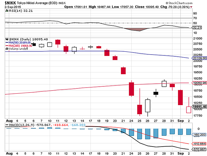 Volgens het IMF zal de schade van een Chinese vertraging aanzienlijk zijn. Als de Opkomende Markten in de regio een schok te verduren krijgen van 1%, dan kan dat Japan 0,5% aan groei kosten. Chinese stagnatie zal bovendien de deflatoire tendensen in Japan versterken. De prijzen van allerlei commodities zijn door de teruglopende Chinese vraag fors in prijs gedaald. Als de olieprijs gaat dalen naar een niveau van $ 40 per vat, dan kan Japan zijn inflatiedoelstelling van 2% wel vergeten. De Bank van Japan meent, dat voor een succesvol opleven van de inflatie een olieprijs nodig is van tenminste $ 70. Volgens Citibank kan het huidige prijsniveau van olie de inflatie van Japan met 1% - 1,5% omlaag drukken. Als dat gebeurt, is deflatie weer een feit.