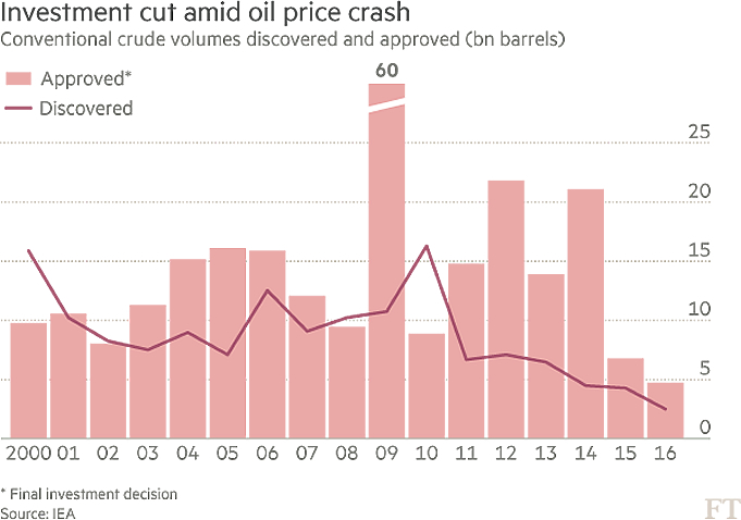 Te lage investeringen in grote projecten met een lange doorlooptijd kan op de langere termijn voor problemen gaan zorgen. Bij het Internationaal Energie Agentschap (IEA) zijn ze bang, dat de huidige trend al kort voor 2020 of kort hierna voor tekorten kan zorgen met als gevolg een sterke prijsstijging. Er is nu echter een groot verschil met eerdere cycli en dat is de schalie-industrie in de VS. Die is weer nagenoeg hersteld van de dreun als gevolg van de aanhoudende prijsdalingen in de afgelopen jaren. Volgens ceo Scott Sheffield van het bedrijf Natural Resources kunnen er alleen al in Permian Basin dagelijks 8 à 9 miljoen vaten per dag opgepompt worden als de prijs rond $ 50 blijft schommelen. Nu komen er dagelijks 2,4 miljoen vaten omhoog. Als deze ceo het gelijk aan zijn kant heeft, dan zullen olieprijzen nog jarenlang laag blijven!