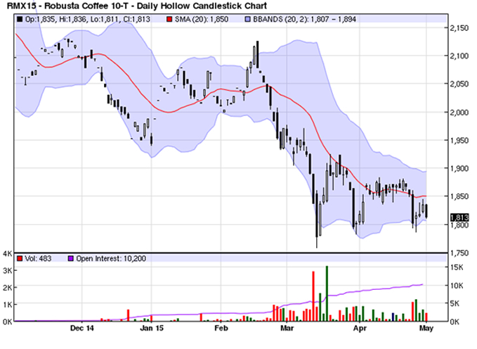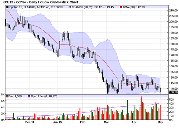 Na een veelbelovend begin van het jaar 2015 is de prijs voor koffie behoorlijk gedaald. Die aanhoudende daling is toe te schrijven aan de zwakke nationale Braziliaanse munt, de reaal. Er gaan steeds meer realen in een dollar. Bovendien is de regen tijdig teruggekeerd, waardoor de angst voor een herhaling van het zeer droge 2014 al snel weer is weggeëbd. Brazilië is de grootste koffieproducent ter wereld. Omdat de regens op tijd terug waren, zijn de verwachtingen over de omvang van de oogst sedertdien alleen maar omhoog gegaan. Zo verwacht de Mercon Coffee Group een oogst van 50,3 miljoen balen. Andere handelshuizen, zoals Volcafe, Marex Spectron en Comixem blijven daar niet veel bij achter met schattingen die variëren van 48,5 tot 49,5 miljoen.