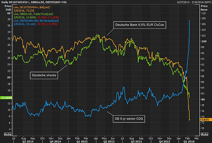 Beleggers twijfelen over Deutsche Bank en doen aandelen en obligaties van de bank in de verkoop. De groene lijn laat zien dat het aandeel op de beurs sinds november vorig jaar in waarde gehalveerd is. De oranje lijn geeft de koers weer van speciale hoog renderende obligaties die Deutsche Bank heeft uitgegeven. Dit zijn obligaties waar beleggers jaarlijks een vergoeding van 6% op krijgen, maar dit in tijden van crisis door de bank omgezet kunnen worden in aandelen. De dreiging dat dit werkelijk zal gebeuren drukte de koers van deze obligaties naar een dieptepunt van 27% onder de uitgiftekoers.