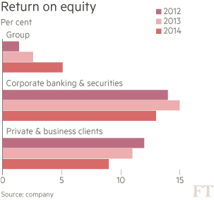 En dus is het tijd voor een nieuwe strategie, die een antwoord moet geven op de bedreigingen van dit moment. De beide ceo ’s, Anshu Jain en Jürgen Fitschen, zullen die waarschijnlijk in mei van dit jaar naar buiten brengen. De markt is echter niet te beroerd om van de zijlijn beide heren te souffleren. Daarbij wijzen ze vooral naar het onderdeel retailbanking. Die tak van sport is volgen hen een sta-in-de-weg voor een voorspoedig herstel van de patiënt. Retailbanking vormt duidelijk een belasting voor Deutsche Bank. In 2014 bedroeg de rentabiliteit op het eigen vermogen slechts 6% en daarmee vormde retaibanking de achterhoede binnen Deutsche Bank. Dat lage percentage maakt het moeilijk voor Deutsche Bank om die rentabiliteit in 2016 op te tillen naar 12%.