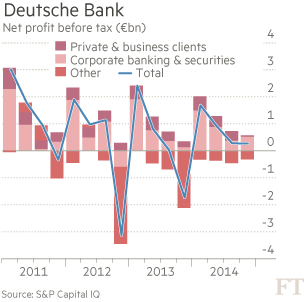Nog geen tien jaar geleden was Deutsche bank een trotse steunpilaar van het Europese bankwezen. Het was een van de weinige beleggingsbanken die rechtstreeks de concurrentie aankon en aandurfde met de grote Amerikanen. Door de crisis is die trots fors geknakt. Bovendien staat de winstgevendheid onder druk. De markt werkt niet echt mee, de bank staat om de haverklap voor de rechter en de toezichthouders formuleren keer om keer nieuwe eisen en voorschriften. In 2014 vertaalde al die ellende zich in een koersdaling van maar liefst 23%.