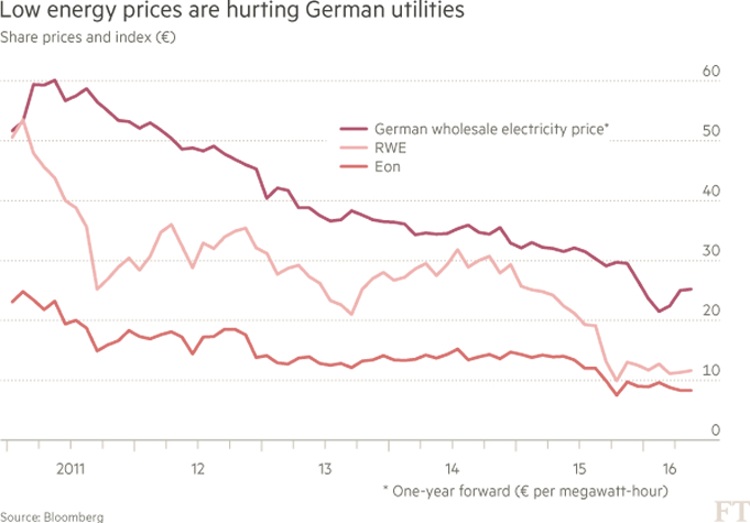 Dat zijn te lage prijzen voor beide bedrijven om zelfs maar break-even niveau te behalen. Het gevolg is dat ze grote afschrijvingen hebben moeten plegen op hun klassieke centrales. Ze zijn derhalve zwaar in de rode cijfers terecht gekomen. In 2015 leen E.On een verlies van € 7 miljard en RWE besloot toch maar af te zien van het betalen van een dividend. Het laat zich raden dat de koers van de aandelen van beide bedrijven dramatisch gedaald is.