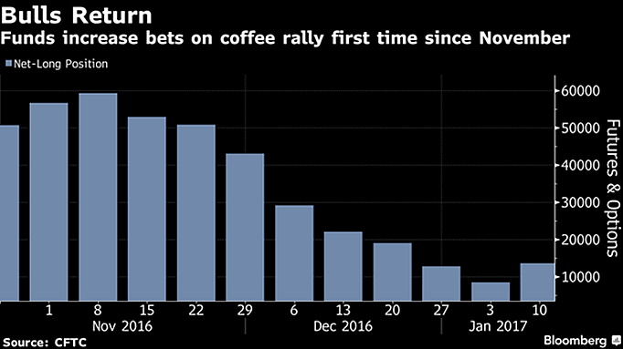 Grote partijen in de koffiemarkt, zoals hedge funds, zien al deze factoren met plezier aan en handelen dienovereenkomstig. Ze nemen weer meer longposities in, omdat ze in het lopende jaar rekenen op een koffierally. Lagere voorraden vormen in hun ogen samen met altijd onzekere weersomstandigheden de beste basis voor prijsstijgingen.