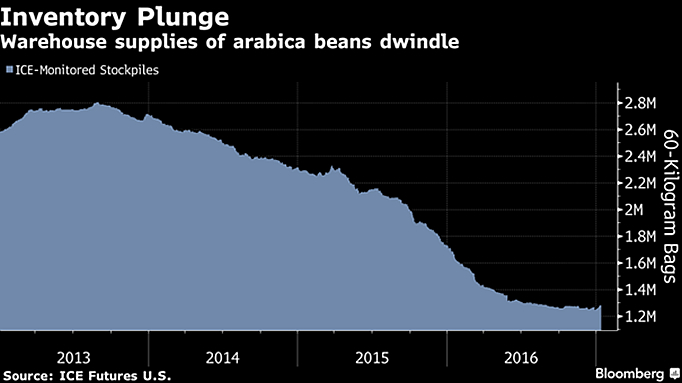 Al een paar jaar op rij ziet the International Coffee Organisation (ICO) de koffievoorraden teruglopen, omdat oogsten tegenvallen. ICO denkt dat het huidige oogstjaar 2016- 2017 ook geen goed oogstjaar gaat worden. Dat is althans het beeld dat een eerste inventarisatie oplevert. De eerste schattingen gaan uit van een oogst van 151,6 miljoen balen. Dat zouden er 200.000 minder zijn dan in het jaar daarvoor. Een baal bevat 60 kilo aan koffiebonen.