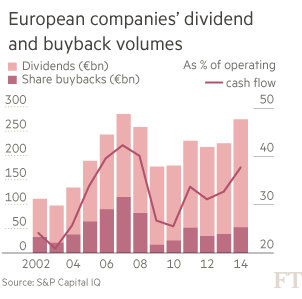 Het zou goed kunnen, dat Vivendi de toon heeft gezet en dat naar Amerikaans voorbeeld de Europese bedrijven steeds meer eigen aandelen gaan inkopen om de koers van het aandeel te steunen. Groei en dus koersstijging zijn vandaag de dag niet langer vanzelfsprekend is. Ze zien zich waarschijnlijk ook gedwongen om een hoger dividend uit te keren om de belegger aan zich te binden. In 2014 werd al een bedrag van € 250 miljard gereserveerd voor beide programma’s. Dat was bijna evenveel als in het topjaar 2007. Het is echter niet overdonderend als we naar het Amerikaanse voorbeeld kijken. Dit jaar zullen Amerikaanse bedrijven voor meer dan $ 1 biljoen besteden aan terugkoop eigen aandelen en het verhogen van dividenden.