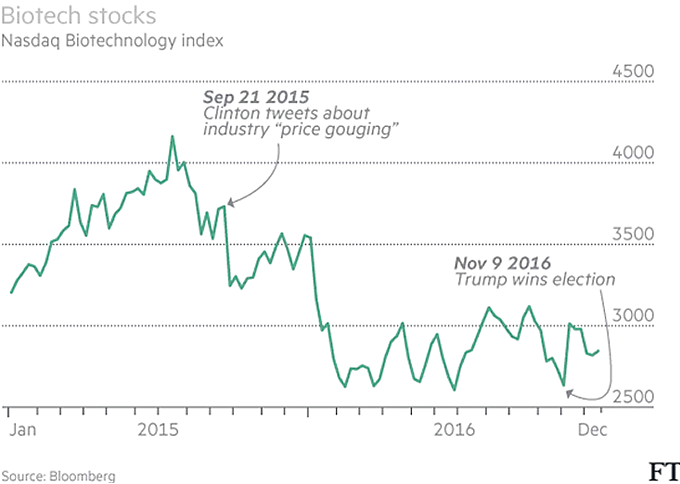 Donald Trump mag dan president worden en niet Hillary Clinton, maar dat is voor veel farmaceuten geen geruststelling. De hoge prijs voor medicijnen was een centraal thema tijdens de verkiezingen en Hillary Clinton hamerde op de noodzaak prijzen op zijn minst te bevriezen. Dat was voor veel farmaceuten vloeken in de kerk, maar de verkiezingsnederlaag van mevrouw Clinton is geen garantie dat alle gevaren geweken zijn! Menig ceo is ervan overtuigd, dat de sector ook in 2017 in de felle publieke schijnwerpers zal blijven staan juist als het om de prijsvorming gaat.