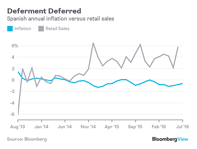 Wat leert de Spaanse praktijk? Sinds het einde van 3013 bedraagt de inflatie gemiddeld -0,4%. In 23 van de afgelopen 30 maanden daalden de prijzen. Volgens de leerboeken moeten consumenten hun uitgaven beperken. Maar de praktijk laat het tegenovergestelde zien, zoals onderstaande figuur mooi laat zien.