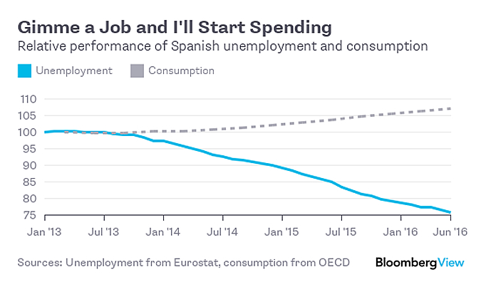 De Spaanse werkloze die weer aan de slag kan, heeft een inhaalslag te maken als het om zijn bestedingen gaat. Die heeft hij/zij in zijn periode van werkloosheid flink moeten inperken. Dankzij zijn nieuwe baan is dat euvel (deels) verholpen. De lage prijzen functioneren als uitnodiging de daad bij het woord te voegen en te gaan spenderen.