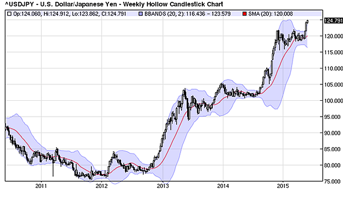 Ook dit jaar is de koersontwikkeling van de Japanse Yen onderwerp van veel felle discussies geweest. Ook Beurshalte heeft aandacht aan deze valuta besteed. De vraag was steeds weer opnieuw of in 2015 de waarde van de Yen ten opzichte van de Dollar door de bandbreedte ¥ 115 - ¥ 122 in de dollar zou kunnen breken in de richting van ¥ 125 - ¥ 130. Cruciaal voor de verdere waardedaling was volgens veel marktinsiders de beslissing van de Fed in de VS om al of niet de rente te verhogen. Een tweede factor van belang is uiteraard de staat van de Japanse economie. Zorgt de huidige stimulering van $ 85 miljard per maand ervoor dat die economie metterdaad gaat groeien of blijft het ene kwestie van voortkabbelen? In het laatste geval zou de Bankpresident Haruhiko kunnen besluiten om de stimulering nog verder op te voeren. De BoJ zou kunnen besluiten om $ 100 miljard per maand uit te trekken voor stimulering. Als dat gebeurt, is een verdere waardedaling van de Yen onvermijdelijk, zo was de verwachting in de markt. Een daling naar ¥ 130 in de dollar heette niet uitgesloten.
