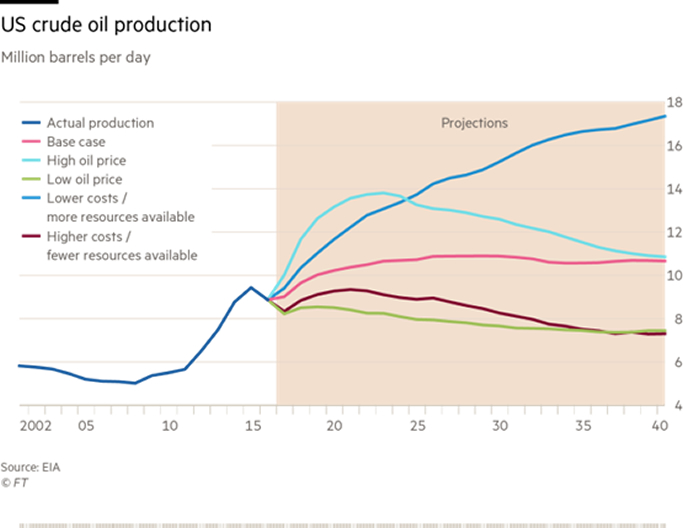 Natuurlijk, het is onmiskenbaar dat de prijsdaling in 2014 vooral toe te schrijven was aan het nieuwe fenomeen schalieolie. Maar wat zegt dat voor de toekomst? Betrokken partijen tasten hierover in het duister. Een juiste kijk op zaken is van levensbelang voor bijvoorbeeld landen die leven van de productie van olie, maar ook voor de winstgevendheid van de oilmajors. Die relateren hun investeringen in toekomstige productie op de perspectieven voor winst. Aanhangers van lower for longer geloven dat de schalie-industrie in staat is de productie op elk gewenst moment op te voeren om de prijzen in de huidige bandbreedte te houden. Tegenstanders van deze optimistische kijk op zaken waarschuwen voor een tekort aan investeringen waardoor wel een tekort moet ontstaan op het moment dat de vraag aantrekt. Prijzen zullen dan sterk gaan stijgen.