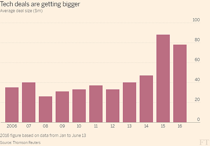 Maandag 13 juni maakte de ceo van Microsoft, Satya Nadella, bekend Linkedin.com te gaan overnemen voor het lieve sommetje van $ 26 miljard. Zoals te verwachten waren de reacties op deze mega overname gemengd. Voor de M&A specialisten was de overname een teken aan de wand. De techsector staat aan de vooravond van een golf aan Fusies & Overnames. Die markt voor M&A is in 2016 toch al heel dynamisch. In de techsector is tot aan de overname van Microsoft al $ 209 miljard aan Fusies & Overnames besteed.