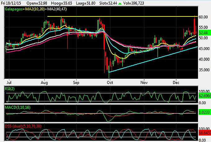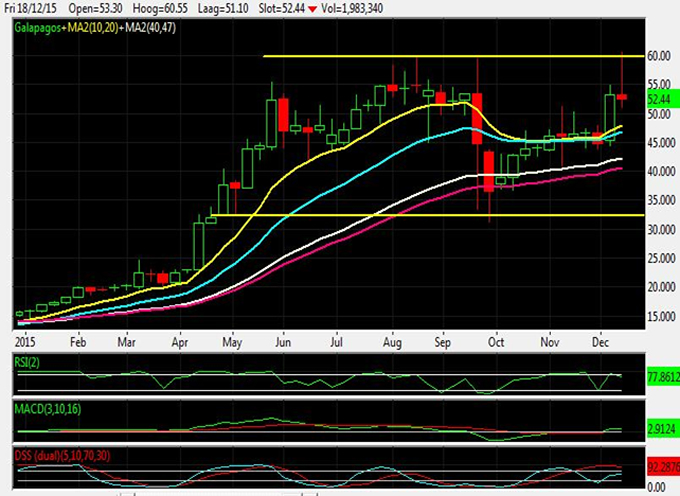 In september tikte Galapagos nog een dieptepunt aan van €31,15 nadat Abbvie met het bericht kwam om niet meer met Galapagos samen te werken. Na deze schrikreactie herstelde het aandeel zich sterk. Galapagos bereikte deze week een ‘all time high’ van net boven de €60 op het positieve bericht van Gilead. Daarmee is de zware weerstand rond €60 nog steeds in tact. Het aandeel kan steun vinden tussen €49 en €51 alwaar de 10, 20, 40 en 47-daags exponentiële moving averages noteren.