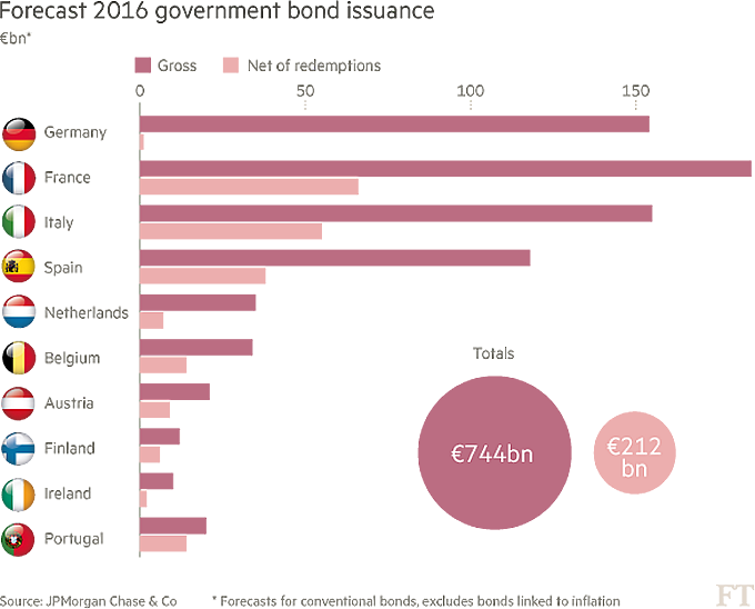 Die groeiende belangstelling laat zich gemakkelijk verklaren. Door de grootschalige introductie van negatieve rentes in de Eurozone, Japan en menig Europees land, kent al meer dan 30% van staatsobligaties in de Eurozone een negatieve vergoeding. Dat wil zeggen, dat aan het einde van de looptijd de obligatiehouder minder terug krijgt dan zijn inleg. Daar komt nog bij dat het aanbod van ‘nieuwe’ staatsobligaties dunner wordt. In 2015 emitteerden overheden voor een waarde van € 790 miljard, maar in 2016 zakt dat naar een bedrag van € 744 miljard. Het ziet er naar uit dat de vraag dit jaar groter zal zijn dan het aanbod. De neerwaartse druk op de rentevergoeding zal alleen maar toenemen. Zoveel lijkt wel zeker.
