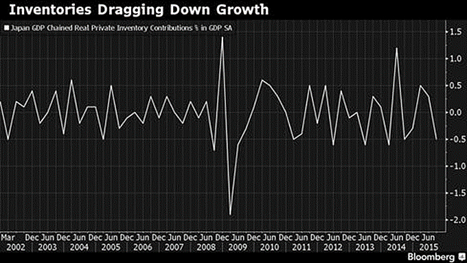 De recessie was van korte duur, maar een jaar later is Japan opnieuw in een recessie beland. In het derde kwartaal kromp de economie op jaarbasis met 0,8%. Er zijn ditmaal geen externe verklaringen aan te voeren voor deze nieuwe tegenvaller. Het lijkt erop, dat het Japanse bedrijfsleven ondanks recordwinsten niet echt in vernieuwing wil investeren. Als het dan al investeert, dan is het vaak over de grens. Over het genoemde kwartaal knabbelde een matig investeringsniveau 0,7% van de groei op jaarbasis af. Die bedrijven waren in het 3de kwartaal ook driftig met het verlagen van de voorraden en ook dat gaat ten koste van de economische groei. De schade bedroeg 2,1%. Hiermee was het kwaad geschied. Een sterke consumptieve groei van 1,2% was te gering om het tij te keren.
