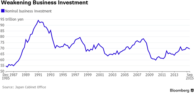 Zoals zaken nu verlopen zal ook een tweede doelstelling van Abenomics onhaalbaar blijven. Het was de bedoeling om het nominale Japanse Bruto Nationaal product over een periode van 5 jaar met 20% te laten groeien naar een omvang van ¥ 600 biljoen. Het is duidelijk dat Shinzo Abe geen tijd te verliezen heeft wil zijn regeringsperiode in 2017 niet in een compleet fiasco eindigen. Of Shinzo Abe ditmaal ook weer kan rekenen op zijn strijdmakker Haruhiko Kuroda, is nog maar de vraag. Uit herhaalde uitspraken van hem valt af te leiden, dat hij er niet veel voor voelt om de koopprogramma’s nog verder te intensiveren. In de praktijk lijkt de effectiviteit van een dergelijk verruimingsprogramma in de loop van de tijd af te nemen. Bovendien is de Bank van Japan naar eigen zeggen tevreden met de onderliggende trend in de inflatie. Die vraagt niet om extra stimulering.