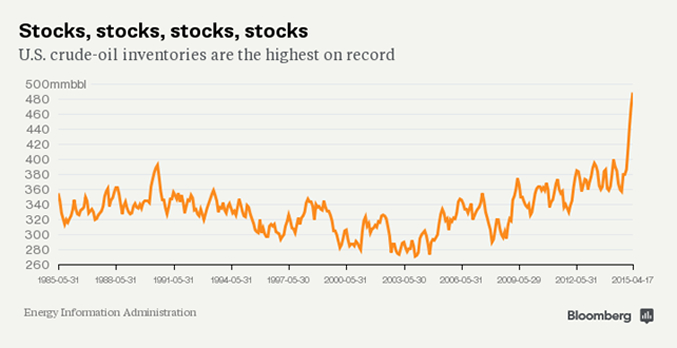Het tweede argument dat spreekt tegen een sterke en aanhoudende stijging is de voorraadvorming in de VS. Die belopen nu bijna 500 miljoen vaten en dat hoogste aantal ooit. Die voorraden lopen alleen maar op, omdat de binnenlandse productie in de VS nog steeds stijgt en export van olie bij wet verboden is.