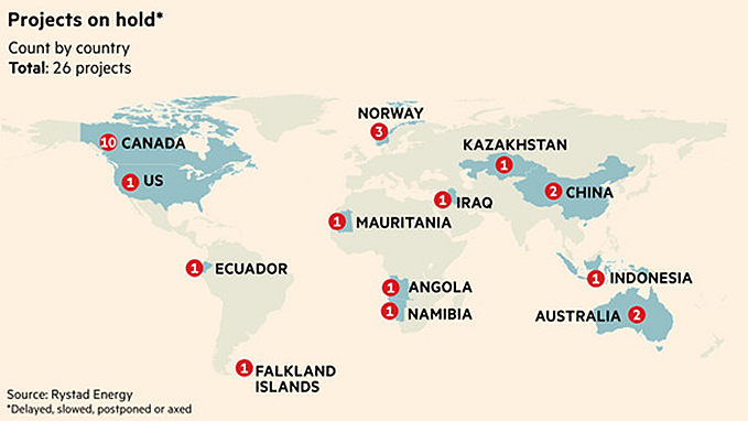 Onderzoekers van Rystad Energy Consultancy hebben berekend, dat de waarde van die 25 projecten maar dan $ 100 miljard bedraagt. Als het stilleggen van de projecten niet tijdelijk, maar definitief blijkt te zijn, zal dat op termijn de wereld 1,5 miljoen vaten per dag schelen.