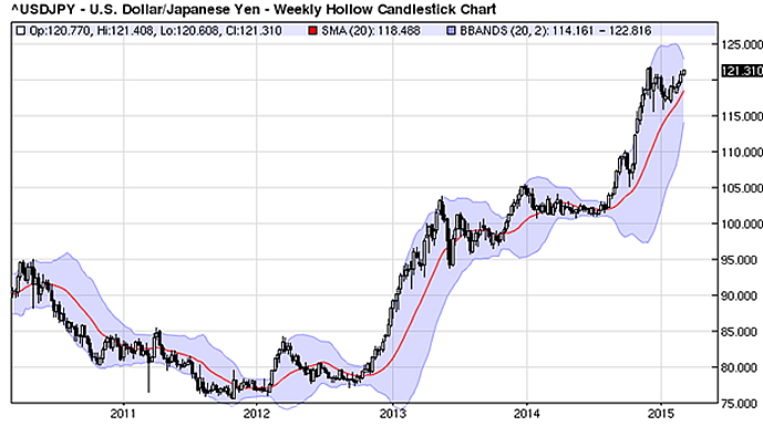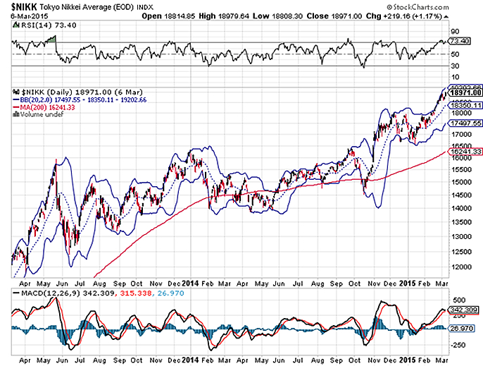 Het land van de Rijzende Zon heeft ook zijn eigen QE programma, dat alweer bijna twee jaar loopt en dat voorlopig tot in 2016 doorloopt. Na een spetterend begin lijkt het erop, dat het herstelprogramma, Abenomics genaamd, begint te verzanden. In razend tempo verloor de Yen aan waarde ten opzichte van bijvoorbeeld de dollar en de euro. Een zwakke yen moest de inflatie opstoken en tegelijkertijd de exportpositie verbeteren. De eerste tegenslag viel al in het tweede kwartaal van 2014 te noteren. De regering Abe verhoogde de btw van 5% naar 8% met desastreuze gevolgen. Japan moest deze beslissing bekopen met twee kwartalen van negatieve groei! De Japanse consument zag zijn toch al geringe koopkracht nog verder aangetast en hield de hand nog steviger op de knip dan voorheen.