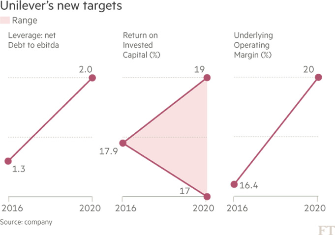 Hoe het ook zij, de bijna overval van Kraft dwong Unilever tot een reeks van maatregelen om de winstgevenheid te verhogen. Dat deed het naar eigen zeggen in samenspraak met 50 belangrijke beleggers. In het oog springende maatregelen zijn onder meer het verhogen van de beoogde kostenbesparingen van nu€ 4 miljard naar een bedrag van € 6 miljard en het verhogen van de dividenduitkering met 12%. Daarnaast gaat het Unilever voor € 5 miljard aan eigen aandelen terug kopen en neemt het meerschuld opzich. Het gaat waarschijnlijk om een bedrag van € 11 miljard. Ook gaat de margarine & spreads business in de etalage, waarvoor het € 7 miljard hoopt te incasseren.