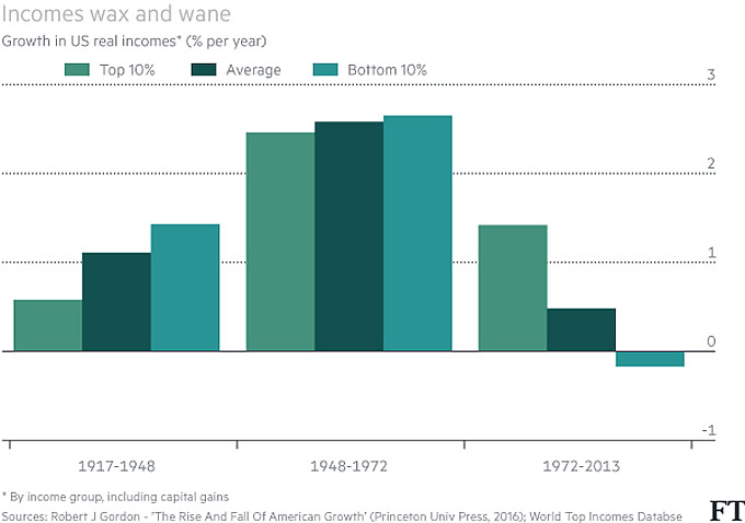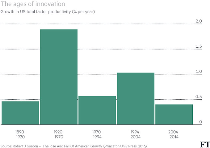 Deze optimisten hebben duidelijk een punt, maar volgens Robert Gordon, auteur van The Rise and Fall of American Growth, is niet elke uitvinding even baanbrekend. In zijn boek onderzoekt Gordon de ontwikkelingsgang van het economisch leven in de VS tussen 1870 en 1970 en de daaropvolgende vertraging van de economische groei. Zijn conclusie is dat groei beslist niet onvermijdelijk is en evenmin evenwichtig. Het huidig tijdsgewricht is er een van teleurstellende traagheid. De oorzaak is niet het ontbreken van innovatie, maar veeleer de beperkte effecten van al die innovaties en technologische doorbraken.