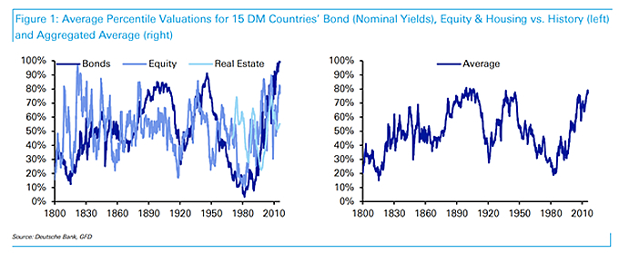 Elk jaar opnieuw publiceert Deutsche Bank haar Long-Term Asset Return Study. Dit jaar stelde de bank zich de vraag of assets zoals aandelen, obligaties en onroerend goed te duur zijn. Het boekje draagt ook de passende titel Scaling the Peaks. Om deze vraag te beantwoorden heeft de bank data verzameld uit 15 landen over een periode van 15 jaar. Het gaat om data van belangrijke landen als Australia, Canada, Denmark, Finland, France, Germany, Italy, Japan, Korea, Netherlands, Spain, Sweden, UK en de US.