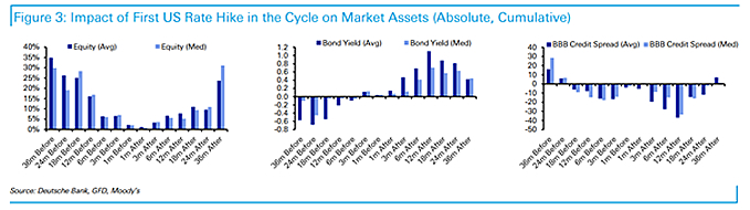 Diezelfde historische data laten zien dat aandelen na een renteverhoging nog maanden in koers blijven stijgen. Ergens tussen 12 – 24 maanden komt de omslag. In het geval van obligaties gaat het om hooguit 12 maanden voordat de omslag komt. Deutsche Bank baseert zijn bevindingen voor aandelen op het berekenen van de koers-winstverhouding op het niveau van de Index. Waren dit soort data niet aanwezig, dan keek de bank naar de nominale ontwikkeling van het bruto binnenlands product (BBP). De rechtvaardiging voor deze aanpak was, dat op de lange termijn winsten gekoppeld zijn aan de ontwikkeling van het BBP.