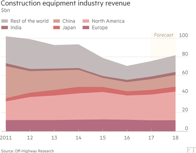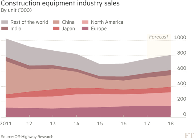 Het waren moeilijke jaren voor de bouwers van zware machines als graafmachines, bulldozers en vrachtwagens. In 2011 zakte de vraag naar dit soort machines in, omdat de weg- en wegenbouw in de welvarende landen inzakte als gevolg van de financiële crisis. Tegelijkertijd zakte ook de economische dynamiek in opkomende markten als China in. Machinebouwers als Caterpillar, Komatsu en Volvo zagen hun verkopen inzakken. Het werd nog erger, toen in de jaren 2014/2015 ook nog eens de Commodity Super Cycle hortend tot stilstand kwam.