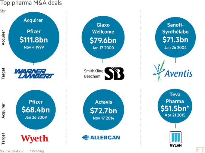 Het afgelopen jaar 2014 was het jaar van de terugkeer van M&A. Voortgedreven door hoge koersen en lage rentes gingen bedrijven de boer op om hun marktpositie te verdedigen of verder te versterken. De sector die in het M&A geweld van 2014 het meest aan de weg timmerde was die van de Pharma. Vanaf het begin van 2014 tot aan vandaag de dag hebben bedrijven in deze sector 462 miljard gespendeerd om elkaar over te nemen.
