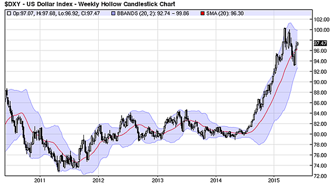 Een paar maanden hebben de kenners het gelijk aan hun kant gehad. De dollar daalde in die periode van pakweg $ 1,21 in de euro in januari naar $ 1,05 in maart. Maar in april moest de schijnbaar onoverwinnelijke dollar fors terrein prijsgeven op bijvoorbeeld de euro. Ook nu waren de oorzaken voor deze teleurstelling snel gevonden. Het was volgens insiders veel te snel gegaan met de waardestijging van de dollar ten opzichte van concurrerende valuta’s als euro en yen. Bovendien begint de markt met het verstrijken van de tijd meer en meer vraagtekens te zetten bij de kracht van het economisch herstel in de VS. Ook begonnen geruchten aan kracht te winnen, dat de Fed wel eens zou kunnen besluiten om in 2015 maar af te zien van een renteverhoging. In april moesten veel bedrijven melden, dat de dure dollar hen veel nadeel in het buitenland berokkende. Ze wezen daarvoor niet alleen het beleid van de Fed als schuldige aan, maar ook de ECB en de Bank van Japan, die de economie massief bleven stimuleren. Een renteverhoging zou wel eens dramatisch uit kunnen pakken voor de bedrijven, maar ook voor bijvoorbeeld de arbeidsmarkt.