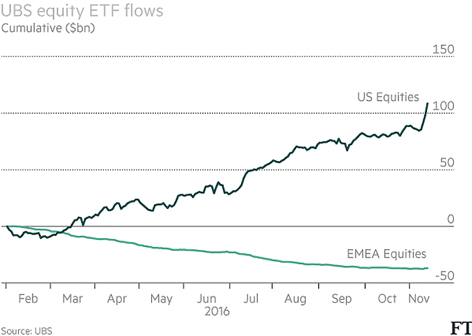Daar komt nog iets bij. Uit data verzameld door UBS blijkt dat er sinds de verkiezingen in de VS een gapende kloof is ontstaan tussen de instroom in Amerikaanse ETF’s en de Europese. De kloof is $ 145 miljard groot. Nog niet zo lang geleden was dat slechts $10 miljard. Een herschikking in de richting van Europa lijkt logisch en noodzakelijk. Daarvoor is dan weer wel een herstel van de winstgroei een absolute voorwaarde. Maar ook als dat gebeurt is succes natuurlijk niet vanzelfsprekend. Denk alleen maar aan de politieke risico’s in de vorm van een reeks van verkiezingen. Een ongewenste uitslag kan voor een bloedbad op de beurzen zorgen. Zeker Ameikaanse beleggers koesteren bovendien de nodige bezwaren en vooroordelen jegens Europese bedrijven en zeker jegens Europese overheden. Gelukkig vallen alle verkiezingen in de eerste helft van 2017. Naarmate het jaar vordert zal de risicopremie waarschijnlijk lager worden. Wie vroeg posities inneemt kan dan in tweede instantie spekkoper zijn!