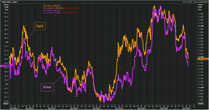 De goudprijs zakte woensdagmiddag met ongeveer één procent naar $1.200 per troy ounce, het laagste niveau sinds februari dit jaar. De zilverprijs in dollars ging met 2,3% onderuit en noteert op het moment van schrijven $16,26 per troy ounce. De prijzen van beide edelmetalen gingen vlak na de Amerikaanse verkiezingen ook al onderuit, omdat beleggers vluchten richting de Amerikaanse dollar.