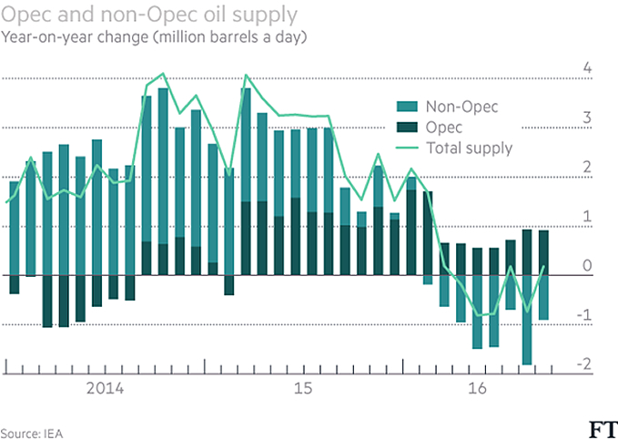 Opec slaagde er ook in om ook andere Non-OPEC leden in de problemen te brengen, die te duur produceerden. Daardoor daalde de productie van de NON-OPEC leden behoorlijk en daar trok OPEC op zijn beurt profijt van. Door de lage prijzen steeg de vraag sneller dan verwacht en wel met 3 miljoen vaten per dag in plaats van 1 miljoen zoals het Internationaal Energie Agentschap had voorspeld. Voor NON-OPEC had het IEA voor 2017 een totale productie voorspeld van 59,4 vaten per dag. Daar zijn er recentelijk nog 57 miljoen van overgebleven. In 2017 zal de vraag naar OPEC olie daardoor 3 miljoen vaten per dag hoger uitvallen dan tot nu toe berekend. Daar komt nog bij, dat investeringen in nieuwe oliebronnen nagenoeg tot stilstand zijn gekomen en dat zal niet snel veranderen, zelfs niet bij een prijs die boven $ 50 per vat uitstijgt. Aan het eind van dit decennium zal er maar liefst $ 740 miljard minder geïnvesteerd zijn. Dat speelt in het voordeel van OPEC.