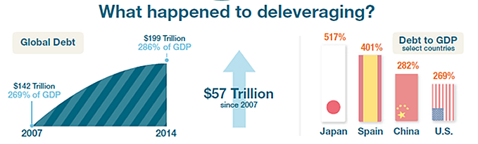 De riskante zoektocht naar rendement is het gevolg van een grote anomalie op de wereldwijde financiële markten. De rente in veel zogeheten ontwikkelde landen is extreem laag en de rentevergoeding op staatsobligaties is zeker in Europa vaak zelfs negatief. Dat is de ene kant van het verhaal. De andere kant is, dat de verschuldiging van overheden en private sector niet afneemt, maar zelfs de neiging heeft om te blijven groeien. Volgens de BIS, the bank for international settlements, is de schuld van de 12 grootste economieën ter wereld sinds 2007 met 50% toegenomen tot een bedrag van $ 125 biljoen.