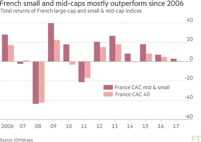 Het is een wetmatigheid dat het succes van Franse small-caps samenhangt met dat van de CAC in Parijs.Frankrijk maakt zich op voor belangrijke verkiezingen en in aanloop daarheen maken internationale beleggers zich alvast uit de voeten. Onder die omstandigheden lijkt een vlucht naar meer liquide aandelen van grote bedrijven voor de hand te liggen. Op dit moment gebeurt echter het tegenovergestelde. De CAC Mid & Small is dit jaar al met 4,3% gestegen na een plus van 10% in 2016. De grote broer, de CAC 40, is dit jaar nog amper van zijn plaats gekomen. Blijkbaar gaan de lokale beleggers niet erg gebukt onder het vooruitzicht van een mogelijke overwinning van Marie Le Pen.