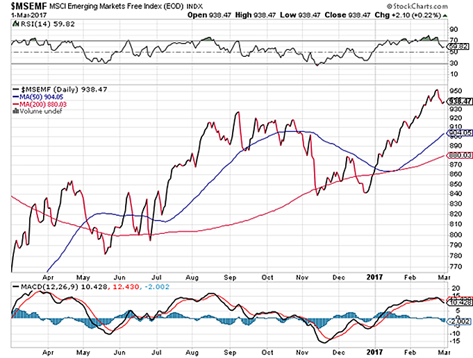 Maar het tij lijkt opnieuw te keren. De Opkomende Markten winnen weer aan elan. Dat is mede te danken aan een zwakke dollar. De zittende regering probeert met wisselend succes de dollar omlaag te praten. De zwakke dollar verkleint de kans op een valutacrisis. Dat is af te lezen aan het herstel van de Mexicaanse peso ten opzichte van de dollar. Een tweede factor van belang is het herstel van de economische groei. Volgens the Institute of International Finance lieten de Opkomende Markten in januari 2017 een groei zien van 6,4%, de hoogste groei sinds juni 2011. Beleggers zijn hier niet blind voor, zoals af te lezen is aan de hernieuwde populariteit van zogeheten Emerging Markets funds. Die kennen voor het eerst sinds vier jaar weer een positieve instroom. In de eerste week van februari bedroeg de instroom $ 2,7 miljard.