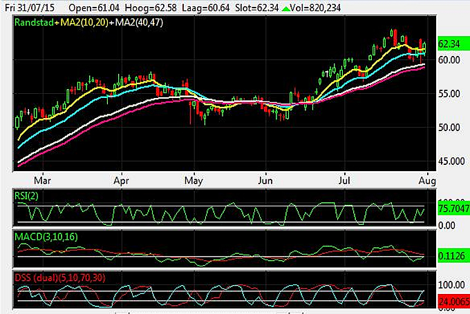 Randstad heeft het laatste jaar een indrukwekkende rally van ongeveer 60% achter de rug. Het aandeel bereikte in juli een all time high van €64,54 waarna de koers wat is teruggevallen. Tussen €58 en €60 vormen de stijgende 40- en 47-daags exponentiële moving averages een solide steun (zie grafiek). Wij verwachten dat het aandeel de komende tijd echter rond de €60 blijft consolideren.