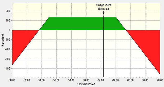Verlies wordt geleden als Randstad te ver ‘uit de band springt’, zijnde €100 per punt daling onder de €53,69 respectievelijk €100 per punt stijging boven €65,31. Uiteraard kunt u op het huidige niveau kiezen voor andere uitoefenprijzen.